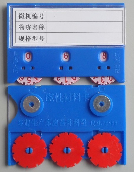 磁性標簽卡(磁性材料卡、材料卡、材料磁性卡、貨架標牌、磁性標牌、磁性標簽槽)適用于商場、文檔室、圖書館、倉庫等場所內,固定或吸附在文檔架、書架、貨架上標示該處物品信息的材料卡 磁性材料卡材質ABS工程塑料,堅固耐用,背面裝有強磁材料或不粘膠,也可以使用開設在底扳上的掛壁式安裝孔固定,便于材料卡在不同材質架上安裝。解決目前在工廠、商場等場所內存儲大量物資所使用的該類倉儲卡信息不全或使用不便,而提供一種可隨時按需、靈活、方便更改材料數量,且結構簡單、合理的材料卡,提高倉庫管理水平,以適應企業(yè)的認證、升級。經上千家企事業(yè)單位、部隊使用,效果良好