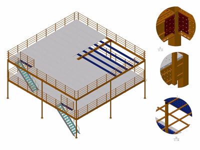 支撐柱采用承載力強(qiáng),各方向慣性矩均等的圓管,主梁和輔梁可根據(jù)承載需要選擇鋼結(jié)構(gòu)理論中為經(jīng)濟(jì)合理不同型號(hào)的H型鋼。樓板系統(tǒng)更能提供平板條形扣板、花紋鋼板條形扣板、鋼隔柵式樓板等3種選擇。