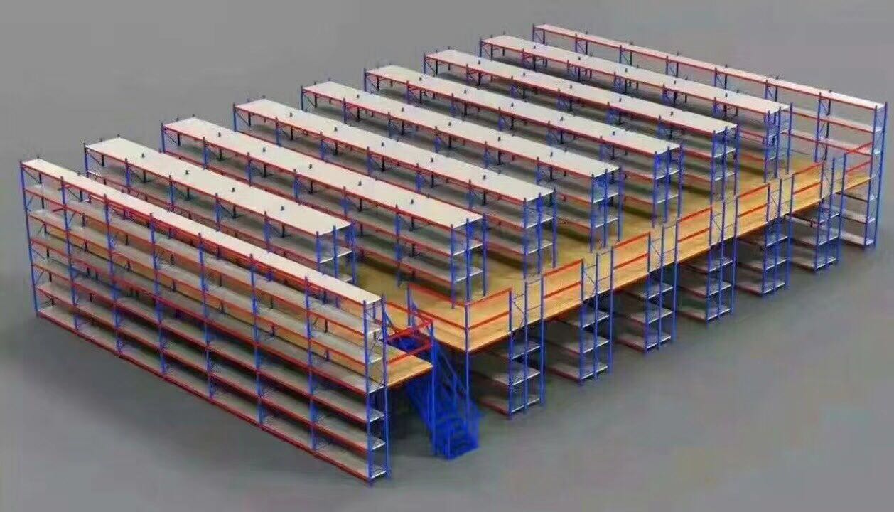 此類系統(tǒng),通常利用中型擱板式貨架或重型擱板式貨架作為主體和樓面板的支撐(根據(jù)單元貨架的總載重量來決定選用何種貨架),樓面板通常選用冷軋型鋼樓板、花紋鋼樓板或鋼格柵樓板。此類系統(tǒng)在汽車零部件領(lǐng)域、汽車4S店、輕工、電子等行業(yè)有較多應(yīng)用。
