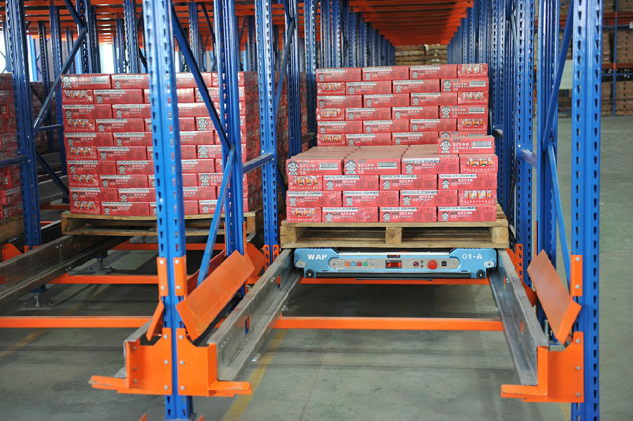 存貨:由叉車將貨物放在貨架巷道導軌的前端,通過無線電遙控操作的WAP-1穿梭車,可以承載托盤貨物在導軌上運行;